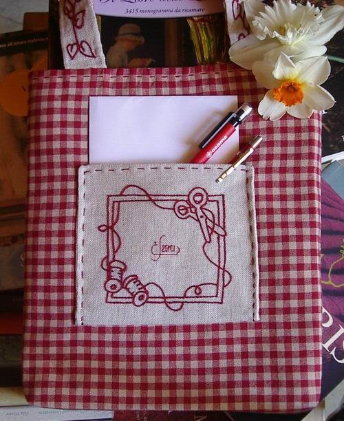 grazie per aver condiviso le tue ricerche, non conoscevo la storia sul redwork, è una tecnica semplice e d'effetto. Complimenti per la borsa portalavoro, è bellissima, mi piace il soggetto e i colori delle stoffe.