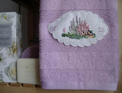Ho dedicato a Chiara, in occasione del suo compleanno, un piccolo giardino ricamato su una nuvola di lino rifinita a punto festone, ritagliata e appuntata sull’asciugamano solo lungo il margine superiore, in modo da lasciare libero quello inferiore per riuscire a stirare il ricamo dal rovescio.
