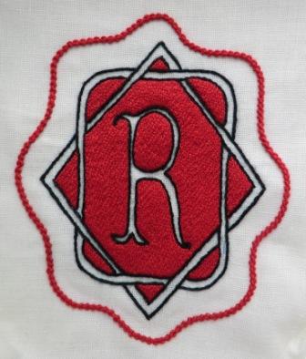 Il mio ricamo in rosso (ritorto fiorentino n°8, colore 6178) è un secondo lavoro fatto a casa con tranquillità. Non ho usato il telaio, ma, su suggerimento della mia insegnante, ho teso la stoffa attraverso qualche spillo applicato sul margine superiore della stessa, sopra a un cuscino di supporto. Volevo un disegno tradizionale, ma in rete non ve n’è traccia. Sono ricorsa dunque alle mie solite fonti, trovando la mia R nel cifrario Janon Co., Fine Hand Embroidery, Monograms, 47 West 34th St, New Yor, scaricabile sull’Internet Archive. Non mi sono però resa conto che, dato lo spessore del filato, lo spazio interno al disegno doveva essere più ampio, in modo da creare un gioco più arioso con il fondo. Un’altra cosa che ho imparato è che mai quanto in questa tecnica il disegno deve essere riportato in maniera impeccabile!