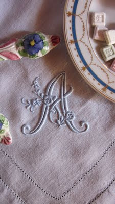 All’inizio mi convinceva poco… adesso mi sono letteralmente innamorata di questo alfabeto, che avevo usato su una mia tovaglia. Ad A… è piaciuta e così ho ricamato le sue iniziali su una tovaglia di un azzurrino chiaro delizioso, già confezionata. Il filato è il DMC n°25, 128.