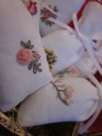 Ho rispolverato il bellissimo libro di Diane Lampe e mi sono lanciata alla confezione di minuscoli sacchettini porta-semi, ricamati con miniature floreali.