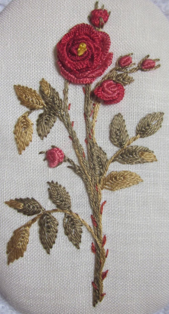 Mi colpì subito per la sua raffinatezza e per l’evidente buon uso del punto mosca fitto per le foglie delle rose. Ho prontamente rubato alla misteriosa e perfetta autrice di quel ricamo la soluzione per le foglie.