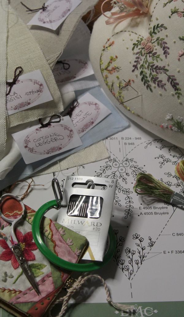 Telaio? Sapete che io tengo quasi tutto il ricamo base in mano. Nei corsi ho testato però l’esigenza di molte, più corrette di me, a usarlo. Dunque vi converrà fare qualche prova, per decidere.