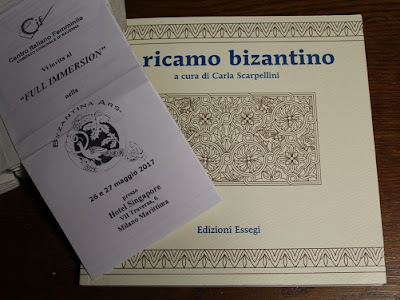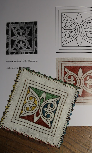 Nel libro Il ricamo bizantino l’autrice svela i riferimenti storici e culturali del ricamo, illustra la tecnica e offre una galleria di disegni. Quello che io ho appreso attraverso il suo libro e alcuni miei campionamenti è un filtro da autodidatta. Segnalo che chi volesse una scuola seria, respirando la giusta aria e senz’altro soddisfacendo anche vista e palato nella terra d’origine, il Centro Italiano Femminile (Comitato Comunale di Ravenna) organizza annualmente un full immersion della Scuola di ricamo Byzantina Ars.