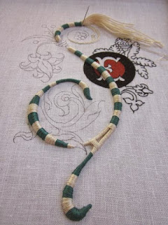 a proposito dei punti di fermo del punto stuoia, il primo esempio mi sembra molto simile al metodo usato nel ricamo giapponese ma li si usa la seta e bisogna essere proprio una capra per non farla brillare. Inoltre il punto di fermo è un ulteriore espediente decorativo certamente non privo di senso. In fondo già il nome "stuoia" da un'indicazione chiara: la direzione dei punti di fermo simula l'intreccio della trama propria di una stuoia.