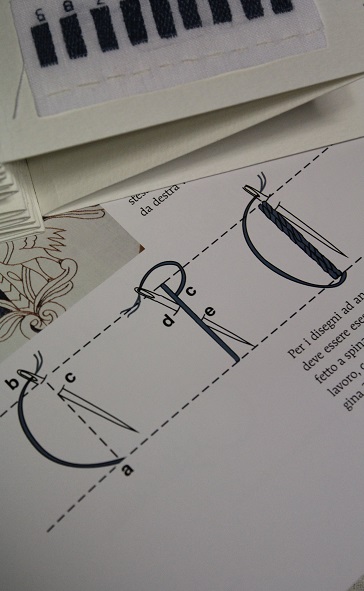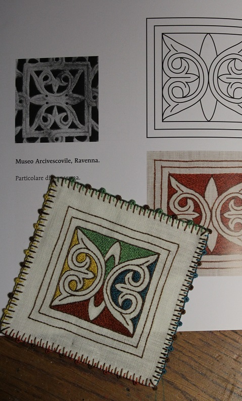 Nel libro Il ricamo bizantino l’autrice svela i riferimenti storici e culturali del ricamo, illustra la tecnica e offre una galleria di disegni. Quello che io ho appreso attraverso il suo libro e alcuni miei campionamenti è un filtro da autodidatta. Segnalo che chi volesse una scuola seria, respirando la giusta aria e senz’altro soddisfacendo anche vista e palato nella terra d’origine, il Centro Italiano Femminile (Comitato Comunale di Ravenna) organizza annualmente un full immersion della Scuola di ricamo Byzantina Ars.