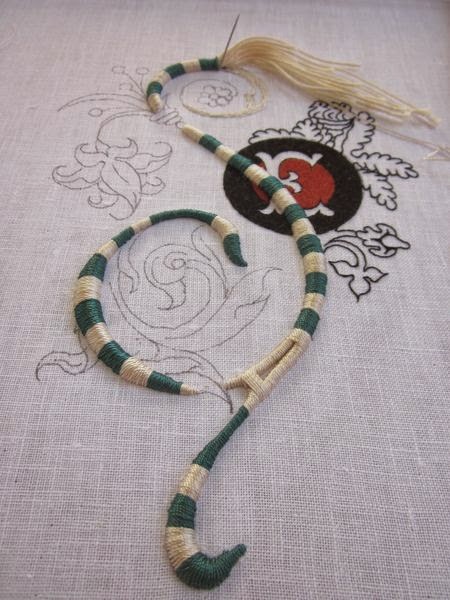 a proposito dei punti di fermo del punto stuoia, il primo esempio mi sembra molto simile al metodo usato nel ricamo giapponese ma li si usa la seta e bisogna essere proprio una capra per non farla brillare. Inoltre il punto di fermo è un ulteriore espediente decorativo certamente non privo di senso. In fondo già il nome "stuoia" da un'indicazione chiara: la direzione dei punti di fermo simula l'intreccio della trama propria di una stuoia.
