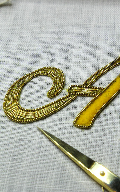 Non ho previsto che sarebbe stato più saggio partire con il couching dalla convessità della curva, anziché dalla concavità, perché avrei ottimizzato il lavoro e limitato l’impatto delle chiusure dei fili oro (dove la punta delle forbici impunemente indica). Non ho poi calcolato che il mio minuzioso e ossessivo riempimento avrebbe ingolfato tutto.