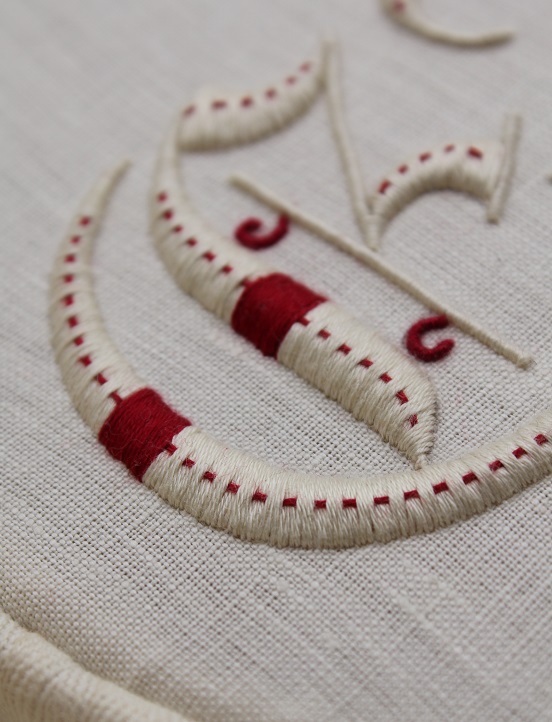 Avvezzi o meno, si torna principianti quando meno te lo aspetti. E io qui avevo ingrandito troppo le lettere. Fortuna, sfortuna… Chi può dirlo?! Cercate in rete la relativa storiella zen: mi ha aperto un nuovo modo di pensare. Trovandomi un rilievo fiacco e deludente, ho sperimentato due approcci diversi: un’imbottitura ricamata a zone concentriche, come ho proposto nelle conchiglie e… L’uso del perlé 8 per l’imbottitura. Mooolto interessante! Non so se si vede, ma la differenza di rilievo è notevole. In foto, il ramo più vicino all’osservatore è tutto in 25, gli altri in 25 con imbottitura in perlè.