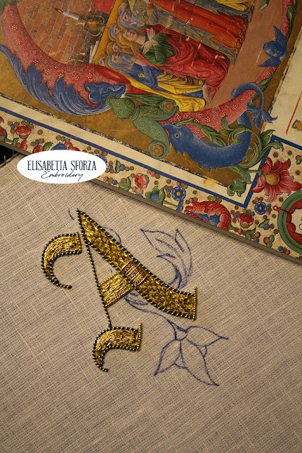 Belli i contorni, anche se quel blu non fa il giusto contrasto. Ho pescato il colore tra quelli che posso ammirare sulle pagine delle Miniature dei corali, il libretto acquistato al Duomo di Siena e che avevo già usato in quel mio primo lavoro dedicato a quel viaggio. Ho dunque deciso di dare al campionario questa restrizione cromatica e, trovando un po’ triste questa sparuta letterina incolore, ho pensato di aggiungere un motivetto ricamato a punto pittura e simili, perché in fondo il mio obiettivo con l’oro è quello di riuscire a metterlo a servizio del ricamo classico, per il quale nutro più interesse.