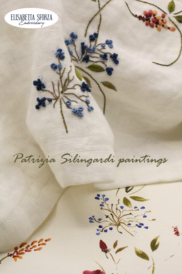 La Gabriella Gabry di Conti e Molinari ci ha fatto recapitare, in groppa a qualche corriere, una tovaglietta confezionata con un misterioso linone, di cui non riesco a carpire i segreti, e, come già vi avevo mostrato nell’ultimo post, io ero corsa a disegnare rami rubati dagli ordinati (…) dipinti della Patty, distribuendoli fluidi sui bordi, con la logica dell’improvvisazione, a me del tutto estranea.