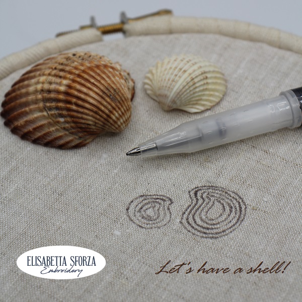 Le zelanti, tra voi, che penseranno di utilizzare tutta questa sovrabbondanza di tempo a disposizione per disegnare 375 conchiglie, ricordo che potreste scoprire che il ricamo delle conchiglie vi annoia e che avreste consumato dunque molta grafite o molto inchiostro per nulla. Preparate invece un paio di filati neutri, tipo DMC 842 e 3865: un beige e un biancastro (ma se non li avete considerate che verranno tutti coperti).