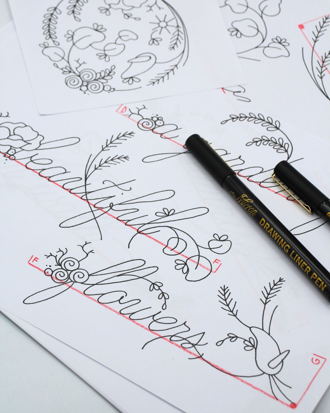 Ricamare la scritta, che corre sui quattro lati di una tovaglietta di 80 cm, ha alterato le mie abitudini, che da un paio di mesi mi accompagnavano con le lettere: qui non aveva più senso lavorare per colore, perché avrei dovuto di volta in volta spostare il telaio. Ne ho approfittato per fare il più possibile in mano, regalandomi un ricamo più sciolto. Ho tenuto a telaio quasi esclusivamente il punto pittura. Le parole sono a punto erba, a un filo, e il font sufficientemente ingrandito per evitare curve troppo strette e perfetto per la continuità di linee, che raramente obbliga a fare salti.