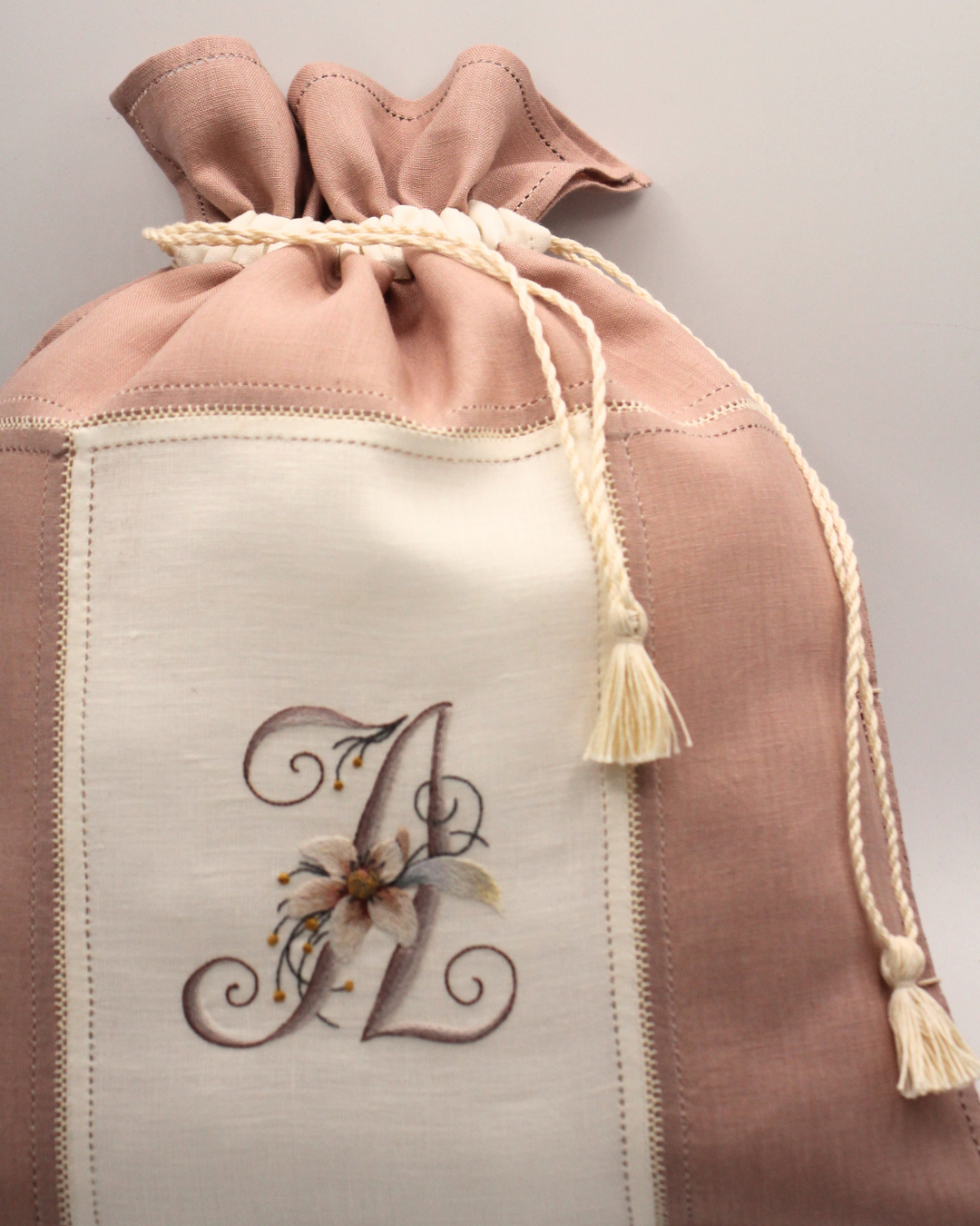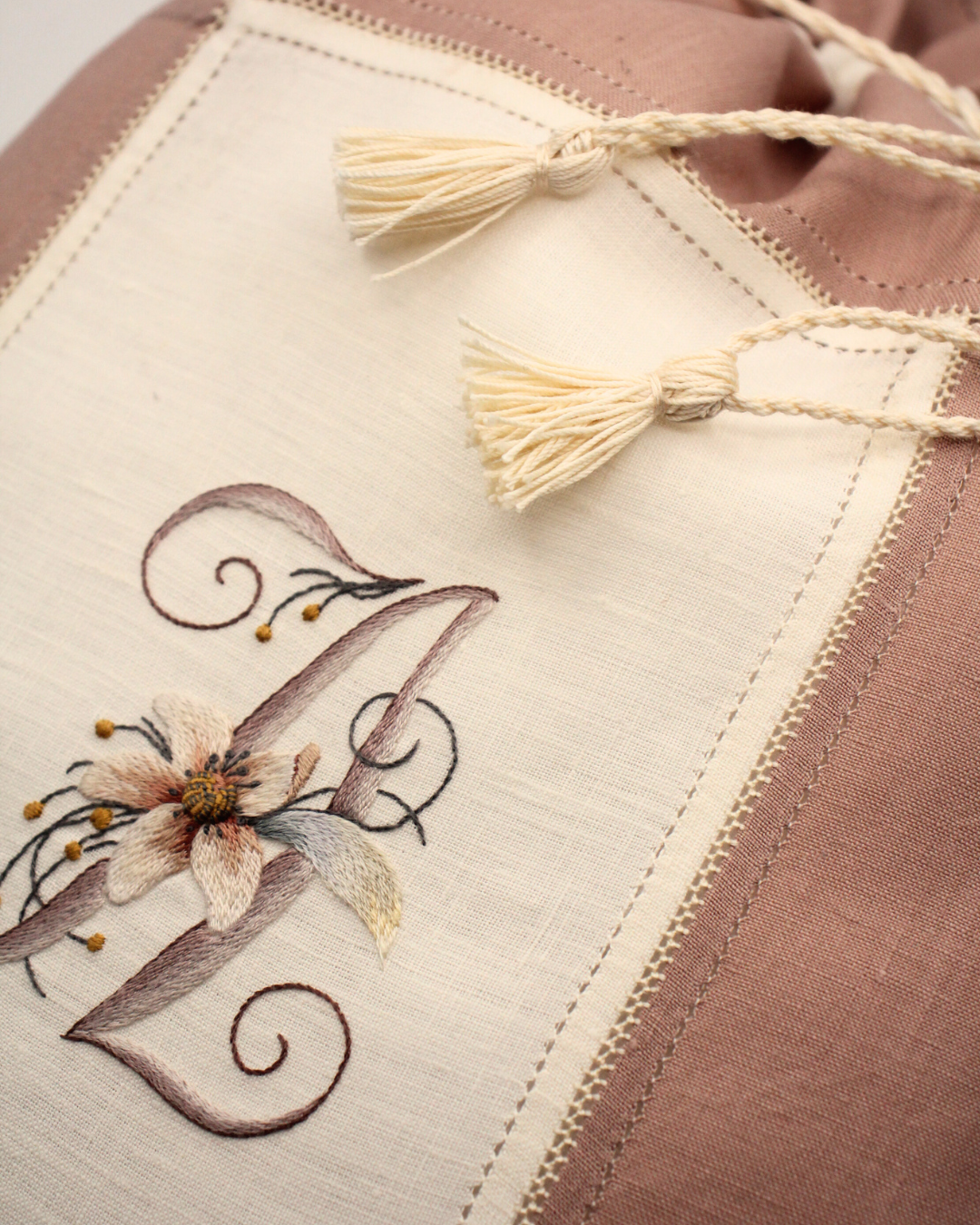 I did and undid to find the right thread and the most pleasing stitch size. In this test, I am working with No. 25 embroidery cotton and embroidering rather small stitches, which span 1 mm of the hem and expand 2 mm sideways.