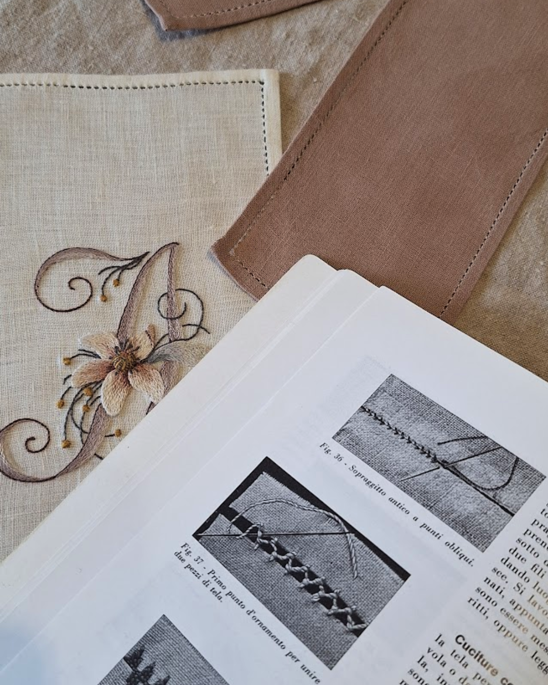 Every now and then, I leaf through my books on Umbrian embroidery, dreaming of having the time to embroider beautiful cushions with buttonhole stitch joints. But I imagine it would be too demanding an occupation at this stage of my life, with children to look after. However, the idea of putting together embroidered and finished pieces, as if composing a patchwork in exquisite embroidery style, has always seemed like a great thing to me, and my daily hour of construction allows me to do some testing, also to check the processing times. The spark was ignited by a reel that I unfortunately cannot find, which showed the assembly of the pieces of a cuff (I think) from a traditional blouse. As sometimes happens magically, a few days later, leafing through my good old embroidery manual, I came across an image that summarised this movement, albeit slightly simplified compared to the reel, which I then decided to try. It is essentially a re-knotted blanket stitch (I would dare to say a “punto in chiaro”) that is worked now on one flap, now on another.
