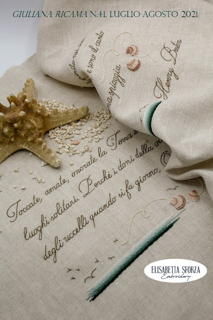 Frullava da tempo la voglia di scriverla tutta a ricamo e ho trovato il coraggio per Giuliana ricama, che mi ha gentilmente offerto la pubblicazione sulla rivista. Ho aggiunto un po’ di mare e qualche conchiglia, del tipo già argomentato nei recenti tutorial.
